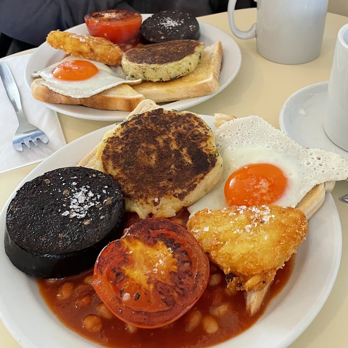 The atmosphere is cozy and has a lovely, relaxing vibe. The music is a bit loud, but I actually enjoyed it. The interior is beautiful on its own, so I hadn’t expected much from the food quality, to be honest—but it turned out to be fantastic. We ordered Set 2 (Vegi) with added black pudding, which was thick and satisfying. The bubble and squeak was also delicious. The prices are reasonable, and both the coffee and tea were even better than expected. I think I’ll be coming here regularly! A couple of suggestions: 1. It would be great to have a mushroom option on the extras menu. 2. The food would be perfect if it were a little less salty. Overall, it was an enjoyable brunch. Thanks!